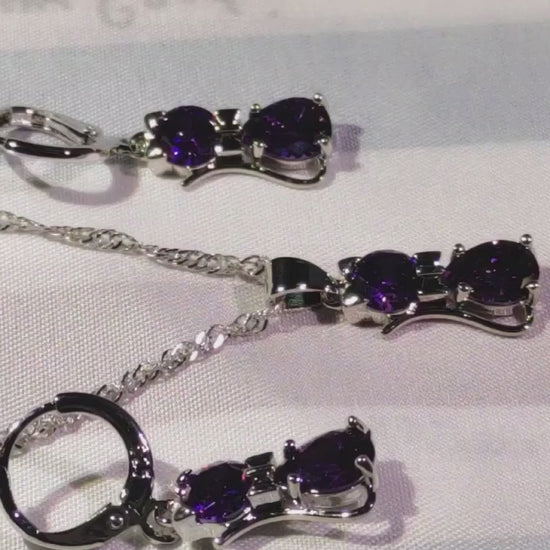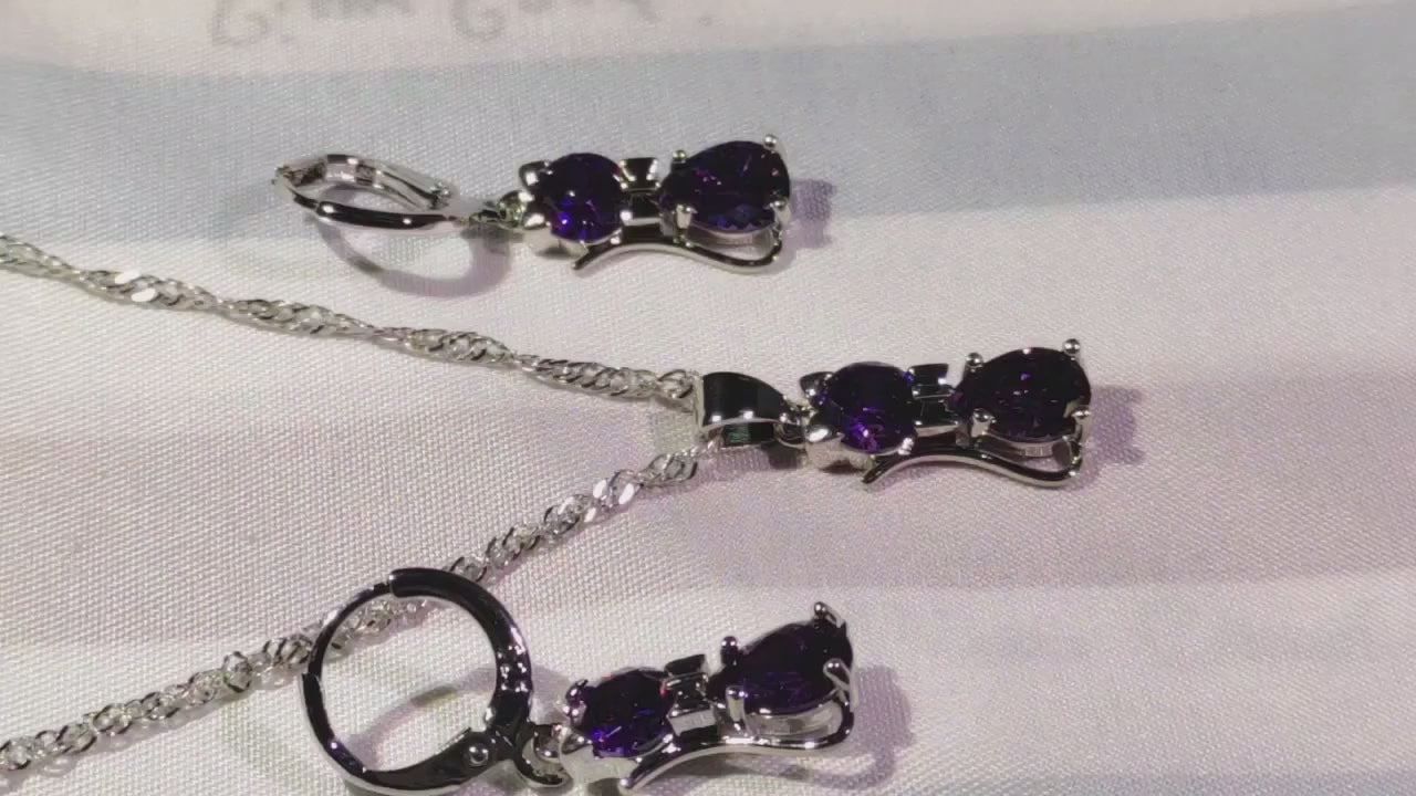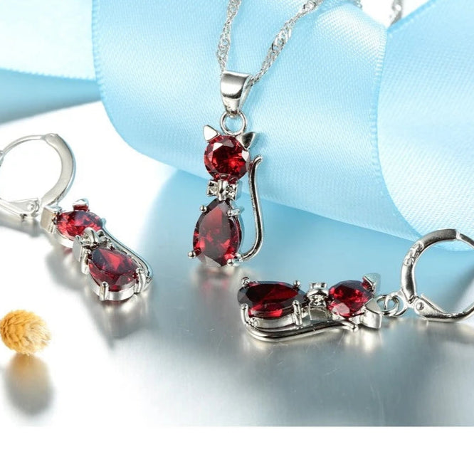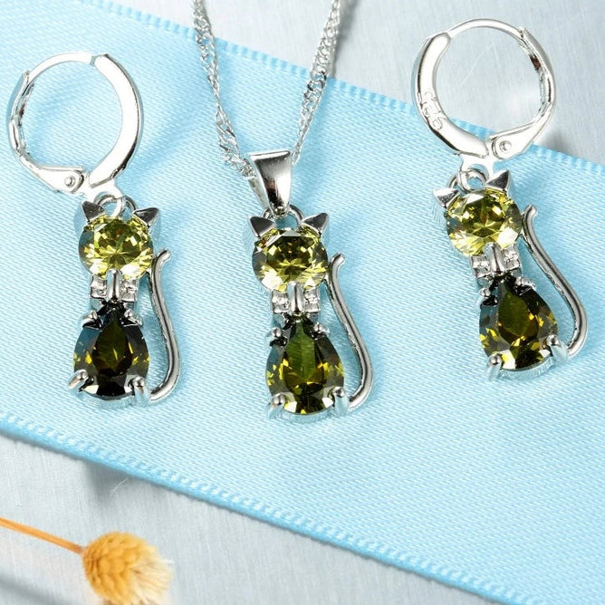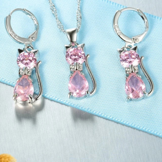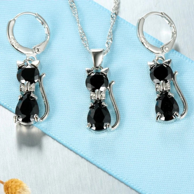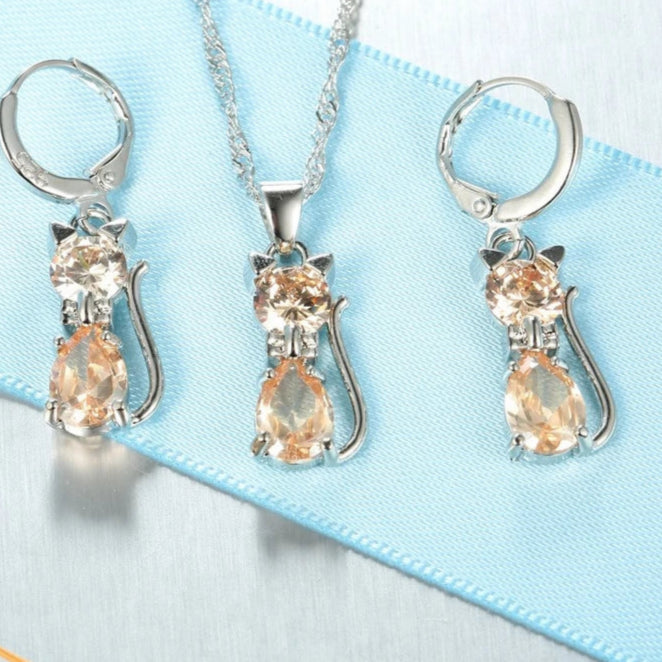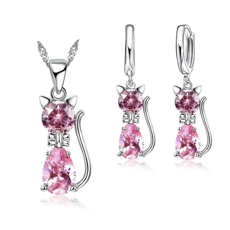 925 sterling ezüst ékszer szett – cica medál nyaklánc és kristályos huggie fülbevaló
