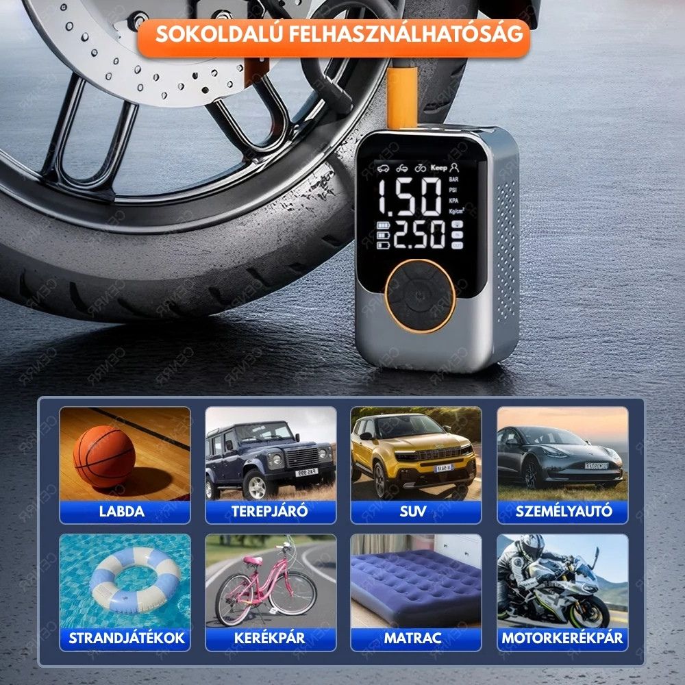 Hordozható elektromos kompresszor autóhoz, motorhoz, biciklihez és labdákhoz – vezeték nélküli, LCD kijelzős, gyors felfújás bárhol, bármikor!
